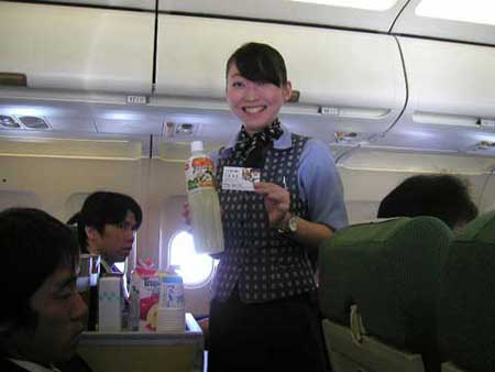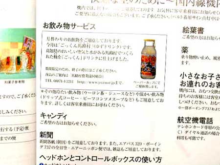 空路で佐渡空港に到着 全日空の機内ドリンクサービスには「ごっくん馬路村」