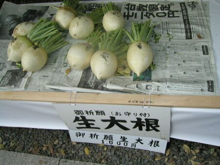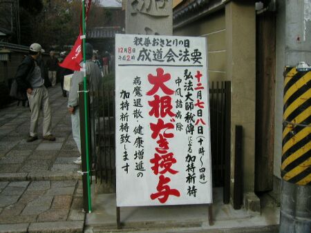 弘法大師秘傳による加持祈祷中風諸病除「大根だき授与」成道会法要。平たく言えば大根のおでん一椀が「参加料1000円」で食べられます。祈祷大根、判りやすくいえば大根一本を1000円で売っているわけでして。これが凄い人出なんですね。近所の八百屋さんで買えば一本せいぜい二百円位じゃないかなぁー、と。「付加価値」ってこんな判り易い事例はないですね。決して押し売りではなく、こんな高いのに、それこそ「喜んで!」買うわけですから。-----------------------------------例えば、この大根を食べても病気になる人はいるわけで。それでも決して怒って怒鳴りこんで行ったりしないもんね。普通、効能や性能が違った商品を買ったと知った場合、クレームがメーカーに入るもんだけど。「この程度の病気ですんでいるのは大根だきのお陰」、となるわけで。この季節におでんの大根というアイデアがいいですね。全国では大根を作っている村は多いもんねぇ。大豊作の時は畑にそのまま放っていて、車から見たらまるで雪が降ったように。あの村やこの村にこの付加価値のことを教えてあげたいなぁ。「それって京都だから可能なんですよ」って言うだろうけど。--------------------------------------------- この「大根だき」は釈迦が菩提樹(ぼだいじゅ)の下で悟りを開いた日(12/8日)にちなむ恒例行事。 鎌倉時代、三世慈禅上人が大根の切り口に梵字(ぼんじ)を書いて魔よけにしたのが起源とされています。聖護院大根のまるまると太った白い大根に梵字を書いてお釈迦さまを偲んだのがこの「大根だき」。 従来はこのまん丸大根を使っていたが、年々参拝者が多くなったことや、従来、お祓いをして栽培していた畑に新幹線が通ったりして大根の数が間に合わなくなり現在、写真のような大根を使っているのだそうです。 ----------------------------------------------- この千本釈迦堂は、京都の町が応仁の乱で焼け野原になってもこの建物だけ残ったという京都で一番古い建物です。----------------------------------- 建物の柱にはこんな伝説が伝わります。大柱の上部に升型の受けがある。これは、時の大工さんが寸法間違いで短く切ってしまったもの。どうしたものか、棟梁窮地に至る。その時、棟梁の妻の名案に因り足りない分を升型の受けを作る事で解決、目出度く完成をみた。竣工後、その妻は自分の提案だと言う事が知られれば夫の功名に差し支えるからと自害したという。その故事に因んで庭に「おかめ観音像」が奉られています。 ------------------------------------------------- この大根だき、サスガに旨い。良妻賢母の為の「料理の腕をあげたい!」祈願に打って付けの「大根だき」だと思ったことです。